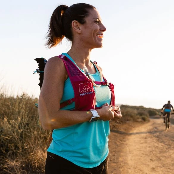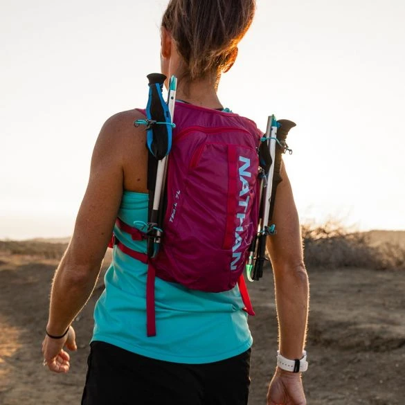De Nathan TrailMix Drinkrugzak 7L sangria/magenta dames is een lichtgewicht, veelzijdig vrouwenvest met een inhoud van 7 liter, inclusief 2 liter drinkzak.