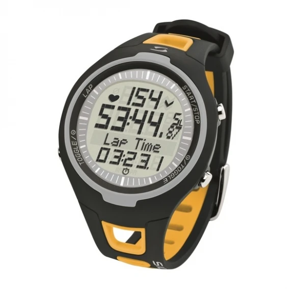 Cirkelvormig telt de PC Sigma PC 15.11 hartslagmeter geel niet alleen calorieën maar ook de ronden die de sporter aflegt.